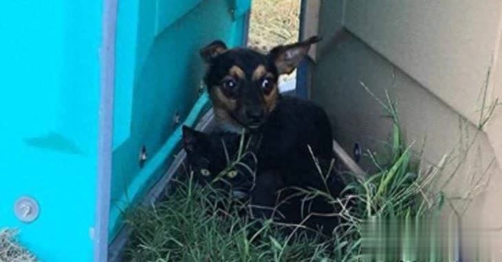 前阵子,美国那边救援队在一处足球场旁,发现了俩小家伙——一条小狗,一只小猫,挤在厕所后面的缝隙里,紧紧靠一起,像两颗肉丸子搂成团。