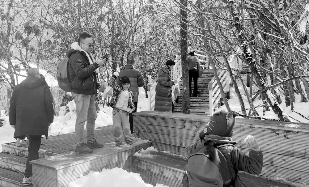 景区游客中心内,身着厚外套的游人摩肩接踵,咨询台工作人员耐心解答着行程疑问,自助取票机前排起了整齐的队伍,不少家庭正带着孩子整理行囊、清点装备,脸上满是对雪山冰川的期待。进入景区后,沿着蜿蜒的栈道前行,远处的贡嘎雪山在阳光下熠熠生辉,近处的冰川如银蛇盘踞,游客们纷纷驻足观赏,举起手机记录下这壮美的自然景观。四号营地的合影打卡墙前更是排起了长队,家长们抱着孩子、情侣们依偎在一起,在“蜀山之王”的映衬下留下珍贵的瞬间,快门声此起彼伏。雪地上,孩子们更是撒欢奔跑,有的弯腰堆起圆滚滚的雪人,用树枝做眼睛、围巾做装饰;有的手持雪球相互追逐打闹,欢声笑语回荡在山谷间,寒意丝毫没有阻挡大家的热情。