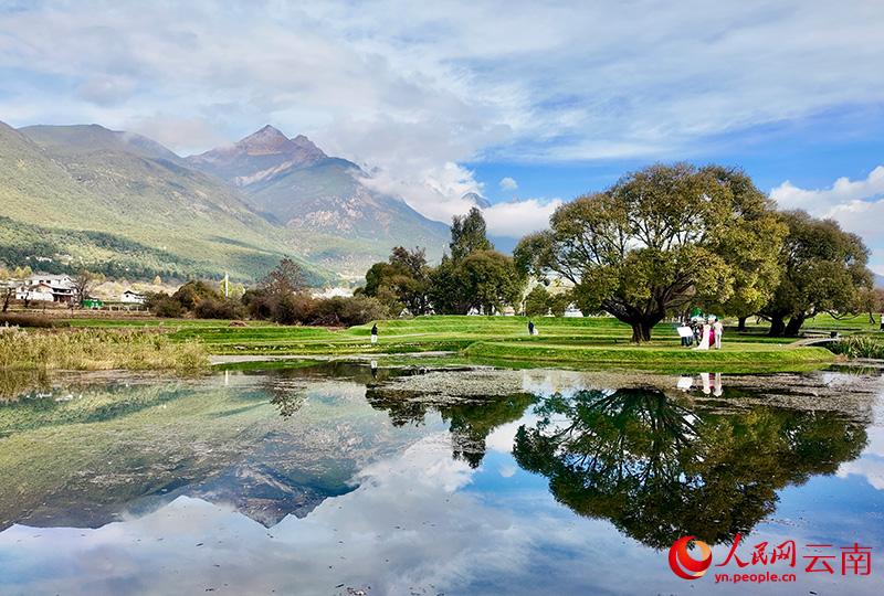 玉龙雪山下游客正在拍摄婚纱照。人民网 王娴摄