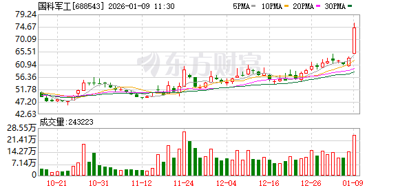 数据宝统计,截至11:12,国科军工成交额14.91亿元,创上市以来新高。最新股价上涨20.00%,换手率18.23%。上一交易日该股全天成交额为9.10亿元。(数据宝)