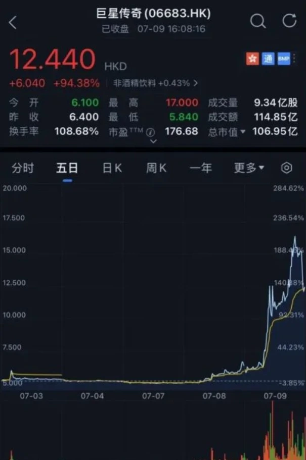 「周杰伦概念股」巨星传奇9日收涨94.37%,单日成交量9.34亿股,成交额达114.85亿港元。
